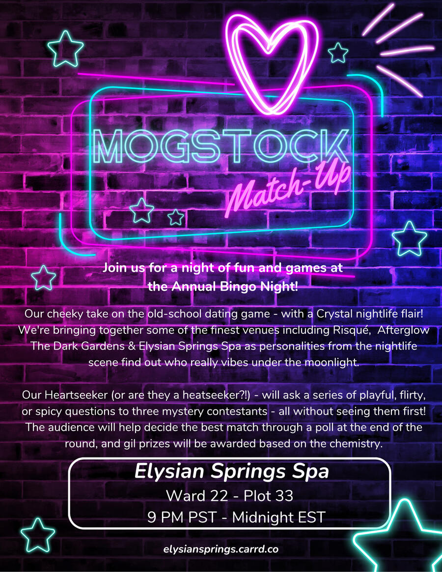 The Elysian Springs is one of Ward 22's most well-known venues and is also owned by two of Mogstock's organizers, Demytrya and Lledwyn Eno'traeh. The Springs will be open throughout the weekend for relaxation and entertainment, though part of that time it will be converted into a nightclub for afterhours Mogstock festival attendees.